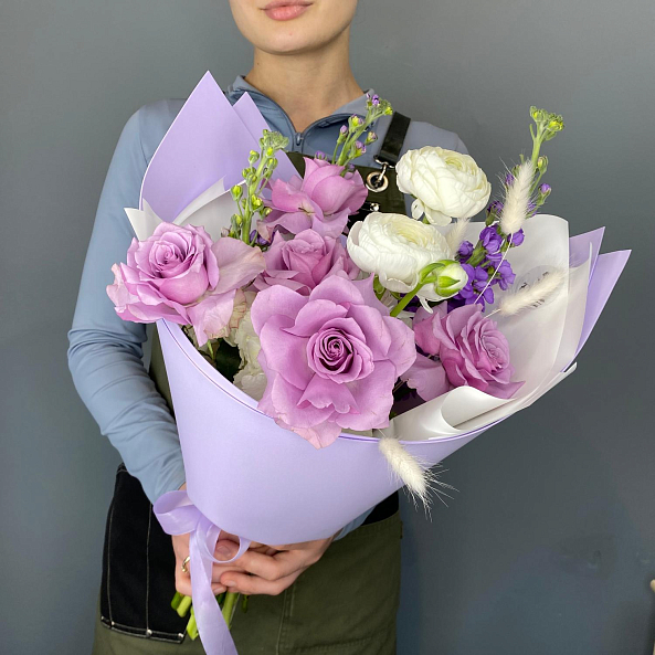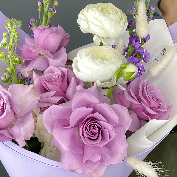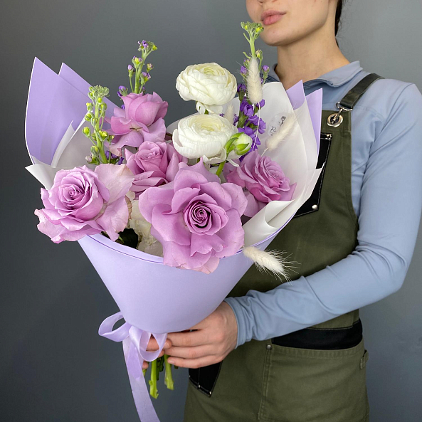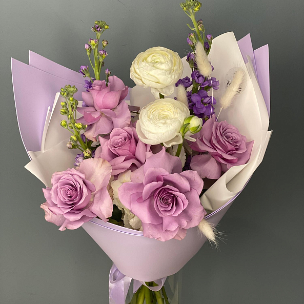 Изящный букет из белого ранункулюса, нежной маттиолы лавандовой , пышной гортензии нежно-розовой и роскошной французской розы. Лёгкий, воздушный и невероятно утончённый — идеален для романтического образа или как подарок по случаю. Вдохновлён весенней природой и женской грацией.