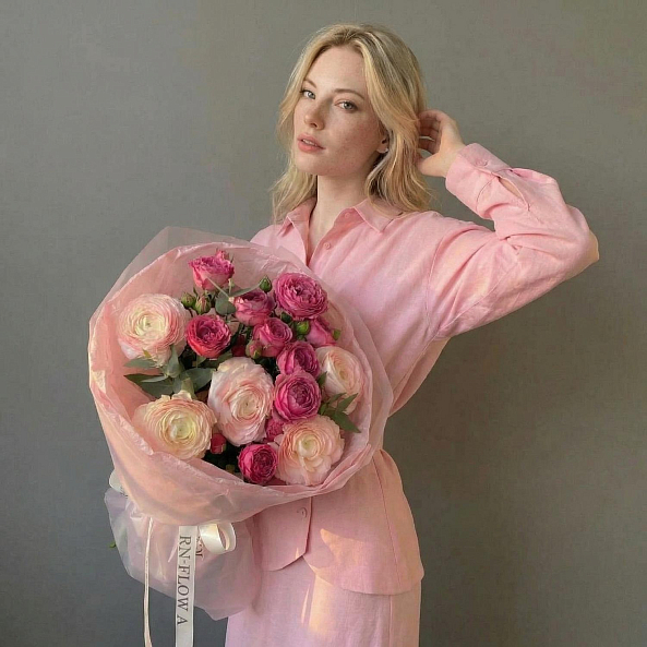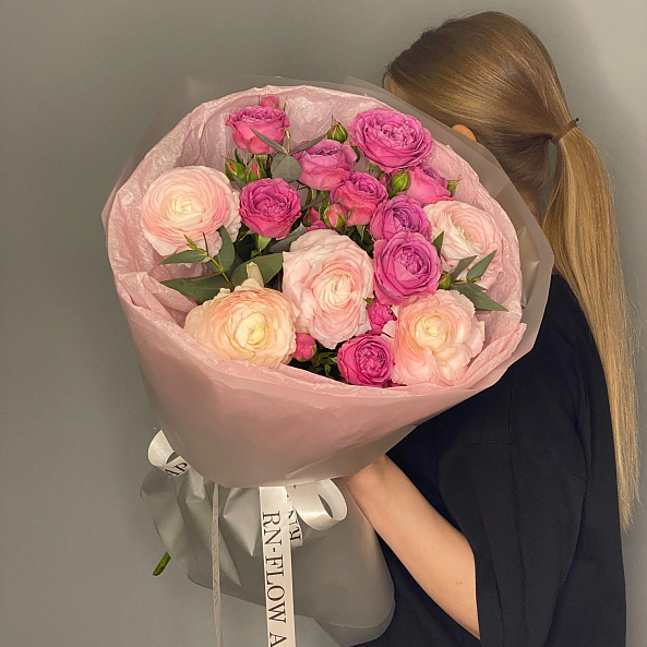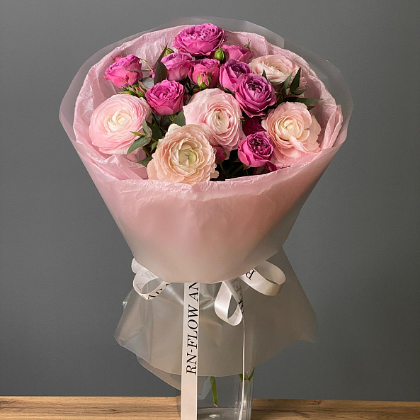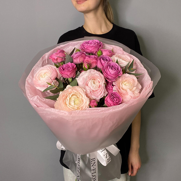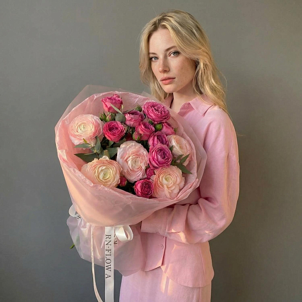 Этот изысканный букет — нежное переплетение пышных ранункулюсов (лютиков), кустовых пионовидных роз и свежей зелени эвкалипта, словно застывший волшебный уголок весеннего сада. Каждый лепесток, от нежно-розовых ранункулюсов до глубоких оттенков пионовидных роз, дарит ощущение тепла и уюта, а аккуратные ветки эвкалипта придают композиции естественную свежесть. Упакованный в розовую кальку с атласной лентой «RN-Flow», букет выглядит лаконично и стильно, идеально дополняя как романтический образ, так и минималистичный интерьер.
