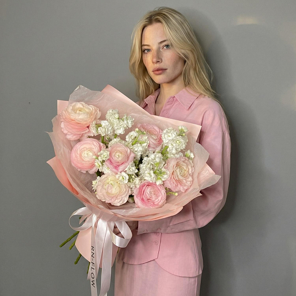 Этот изысканный букет — нежное переплетение пастельных оттенков, где пышные ранункулюсы и объемные гортензии создают композицию, словно застывший утренний рассвет. Каждый лепесток, от нежно-розовых бутонов до кремово-белых соцветий, дарит ощущение тепла и уюта, а аккуратные ветки эвкалипта придают букету естественную свежесть. Упакованный в розовую кальку с атласной лентой «RN-Flow», он выглядит лаконично и стильно, идеально дополняя как романтический образ, так и минималистичный интерьер.