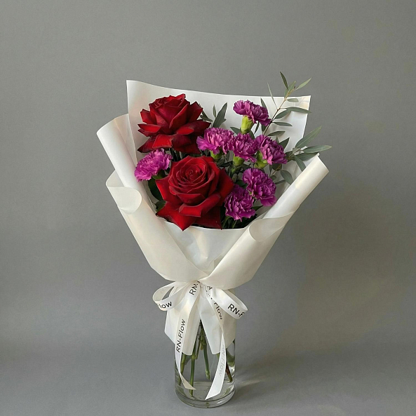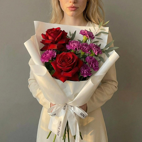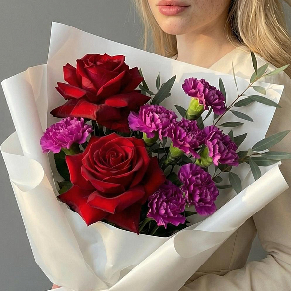 Погрузитесь в гармонию эмоций с этим изысканным букетом, где яркие алые розы символизируют глубокую страсть, а насыщенные фиолетовые гвоздики добавляют нотку искренней благодарности и восхищения. Каждый цветок, словно кисть художника, создает контраст, который превращает букет в живое произведение искусства, а свежая зелень эвкалипта придает композиции легкость и свежесть.