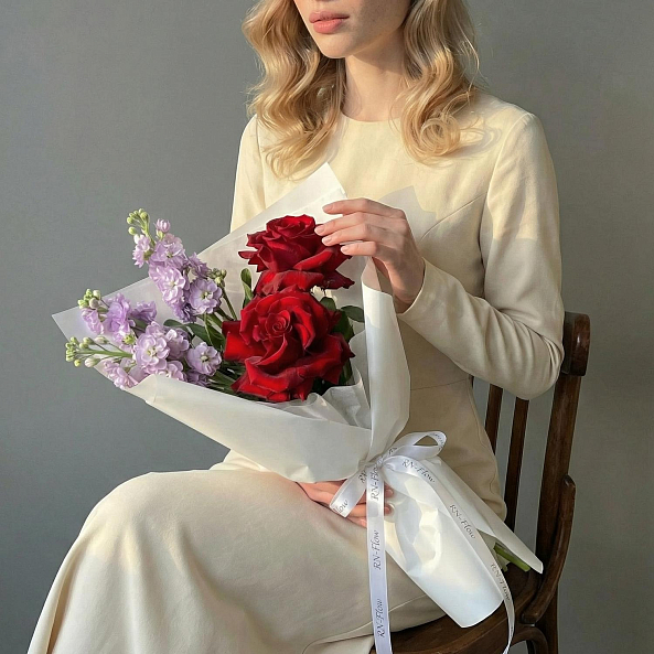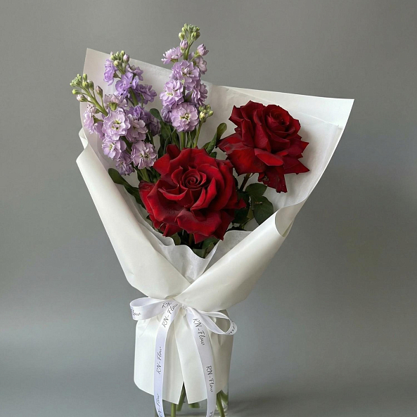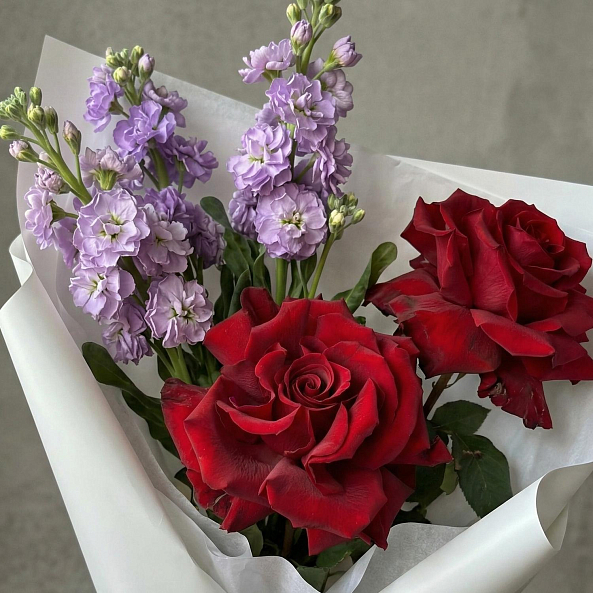 Погрузитесь в гармонию контрастов с этим изысканным букетом, где яркие алые розы дарят ощущение глубокой страсти, а нежные фиолетовые цветы сток добавляют атмосферу изысканной грации и тонкого очарования. Каждый элемент композиции — от пышных роз до мелких фиолетовых соцветий — словно написан на языке эмоций, создавая впечатление, что букет дышит жизнью.