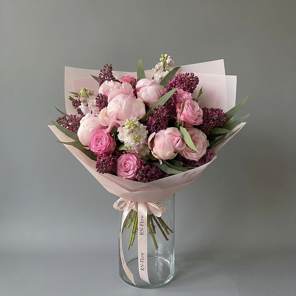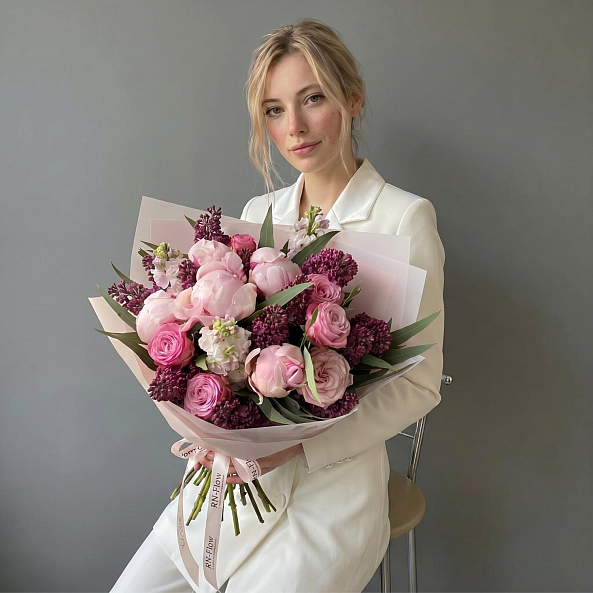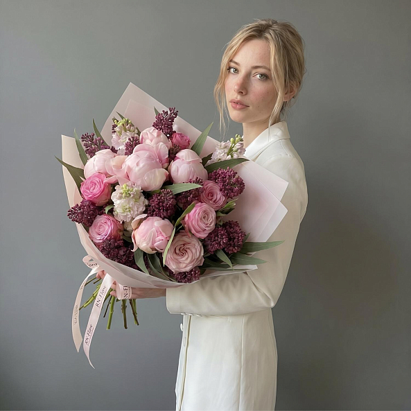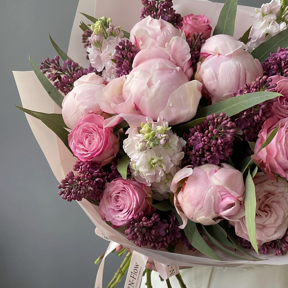 Букет «Весенняя Симфония: Сирень, Пионы «Сара Бернар», Маттиола, Розы «Найтингейл» и «Мадам Бомбастик»»