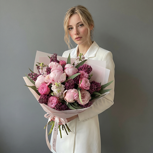 Этот изысканный букет — настоящая симфония пышности и аромата, где сирень в лавандовом оттенке, пионы «Сара Бернар», маттиола, розы «Найтингейл» и кустовая пионовидная роза «Мадам Бомбастик» сливаются в гармоничную композицию, словно застывший момент из самого романтического уголка весеннего сада. Каждый цветок, от нежных соцветий сирени до пышных бутонов пионов и роз, дарит ощущение глубины чувств и утонченности, а многослойный аромат, напоминающий о весенних закатах, добавляет композиции волшебства.