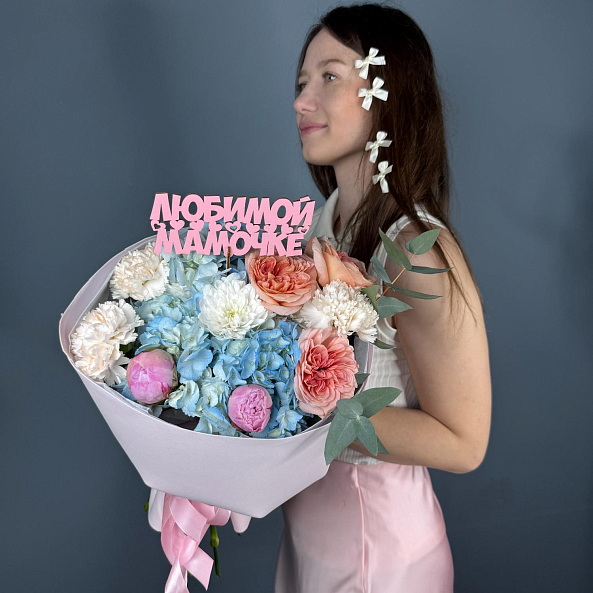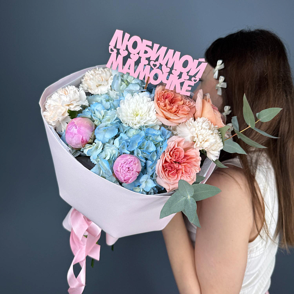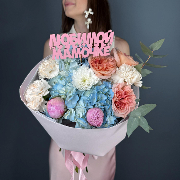 Букет цветов. «Я тебя люблю». Пион, Пионовидная Роза, Гортензия, Хризантема, Гвоздика (диантус).