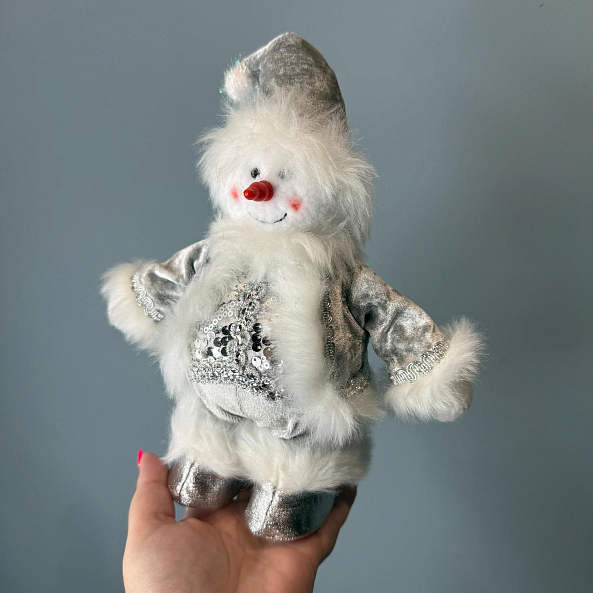 Пушистый снеговик в серебряном костюме с пайетками — не просто украшение, а символ праздника и детства. Идеален для дома, офиса или в качестве подарка.