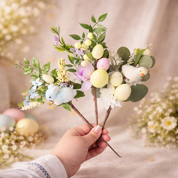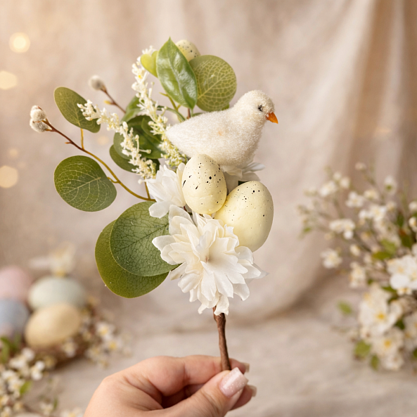 Эта очаровательная ветка — настоящий символ пробуждения весны, где нежный фетровый цыпленок, декоративные яйца с черными точками и белые цветы сливаются в единый волшебный ансамбль. Длина 32 см позволяет создать изысканную компози