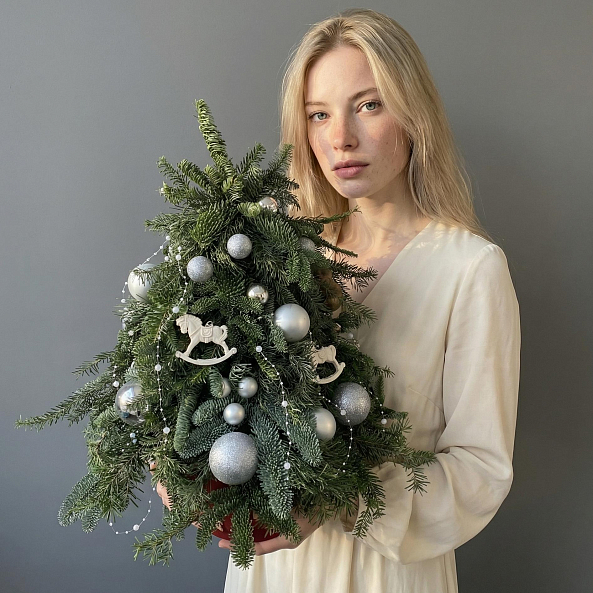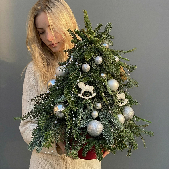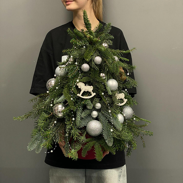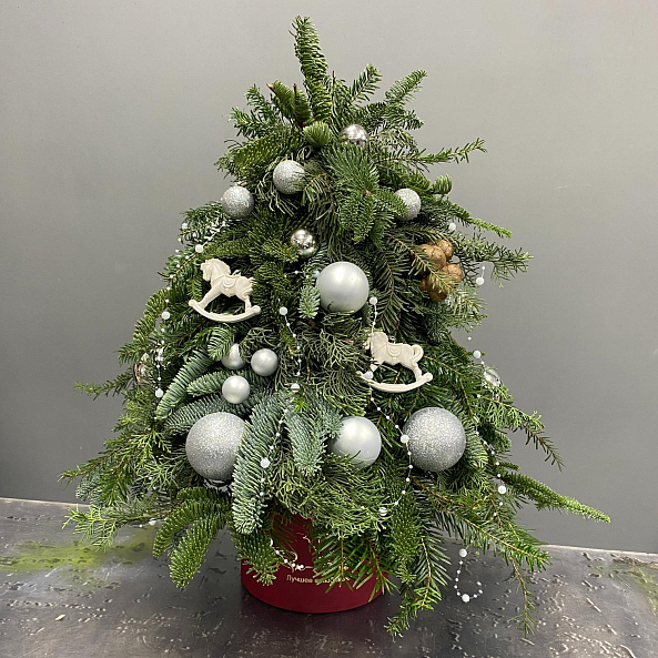 Компактная ёлка из свежей пихты или ели, украшенная серебряными шарами, бусами и керамическими лошадками — идеальна для дома, офиса или как подарок. Ароматная, зелёная, с нотками зимнего леса — она дарит уют и радость.