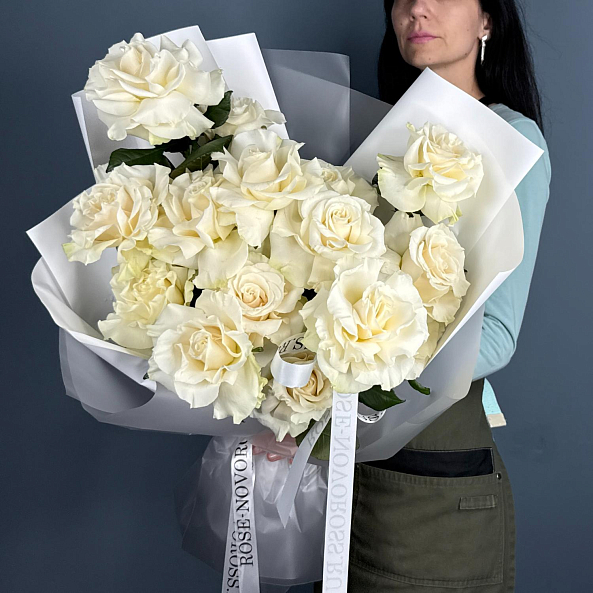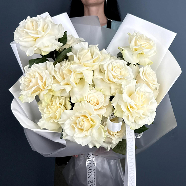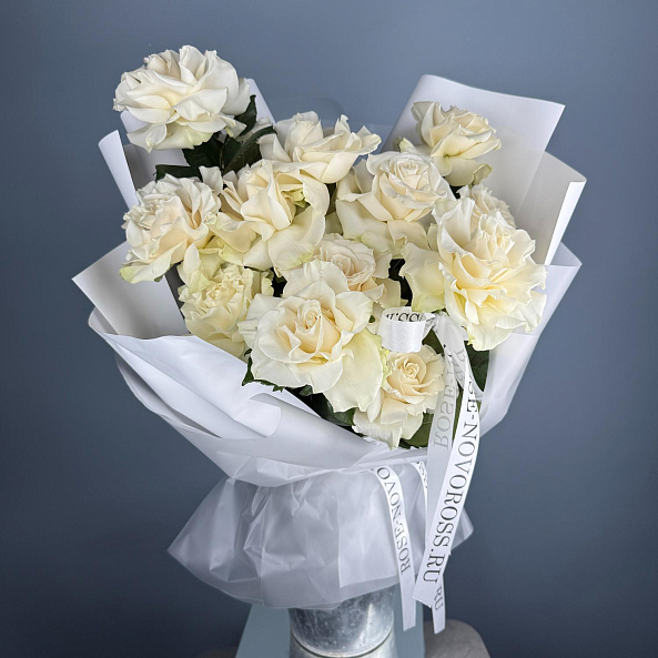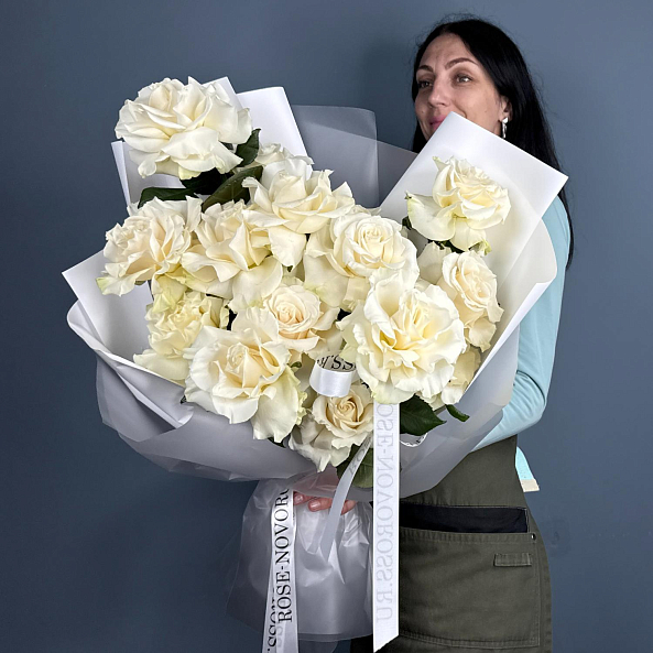 Изысканная классика в каждой детали — букет из 15 французских роз сорта «Мондиаль» станет элегантным подарком на любой праздник.
