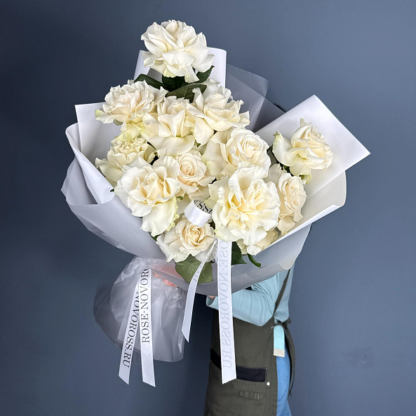 Букет упакован в дизайнерскую упаковку и дополнен атласной лентой — он готов тронуть сердце вашей второй половинки, стать центральным акцентом на свадьбе или торжественном мероприятии или просто порадовать близких без повода.
