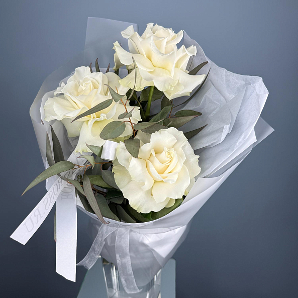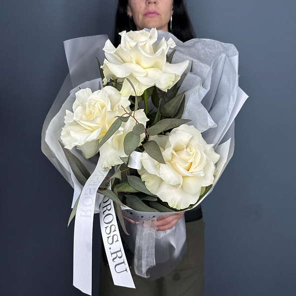 Изящные белые французские розы «Мондиаль» , известные своей густой махровостью и безупречной формой, в сочетании с серебристо-зелёными веточками эвкалипта создают удивительный союз чистоты, свежести и естественной элегантности.