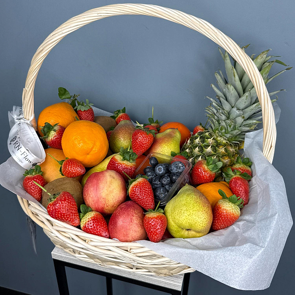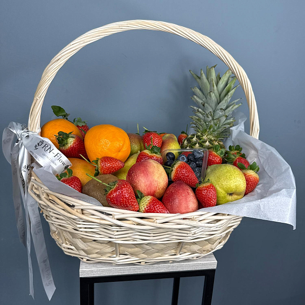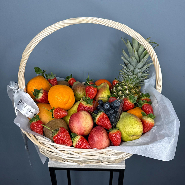 Эта изысканная фруктовая композиция — настоящий взрыв свежести и энергии! В плетеной корзине гармонично собраны сочные апельсины, яркая клубника, сочный ананас, нежные груши, хрустящие яблоки, ароматные киви и душистая черника. Каждый фрукт, тщательно отобранный по качеству и спелости, создает ощущение летнего сада, даже в самый пасмурный день. Упакованная в элегантную белую кальку с лентой «RN-Flow», эта корзина станет не просто подарком, а настоящим произведением искусства, которое подчеркнет вашу заботу и внимание к деталям.