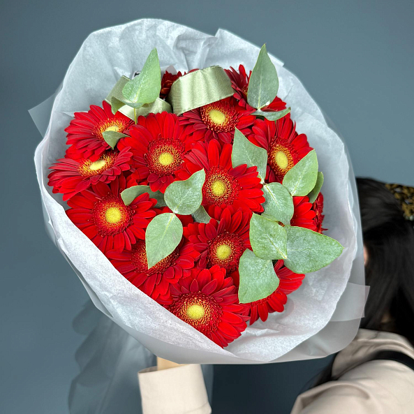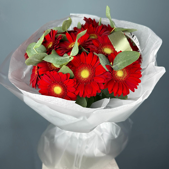 Яркий и энергичный букет из 15 мини-гербер «Красная» с их сочным, насыщенным цветом. Каждый цветок — это взрыв позитива и тепла. Свежие веточки эвкалипта добавляют легкости, природной текстуры и тонкий аромат. Упакован в матовую бумагу с лентой — идеальный выбор для тех, кто хочет подарить заряд радости, страсти и позитива — будь то день рождения, благодарность или просто повод порадовать близкого человека.