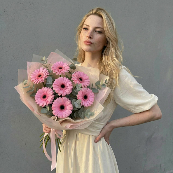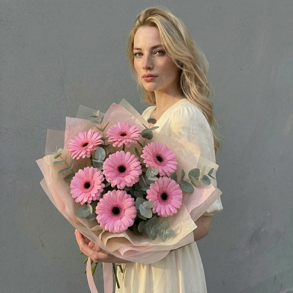 Букет «Розовый рассвет» — это взрыв жизнерадостной энергии и нежной гармонии в одном аккорде. Яркие розовые герберы, символизирующие радость и оптимизм, соседствуют с изысканными веточками эвкалипта, дарящими свежесть и успокаивающую ауру. Каждый цветок, аккуратно упакованный в прозрачную персиковую кальку с элегантной лентой, создает ощущение легкости и воздушности. Идеален для поднятия настроения, подарка на день рождения или просто чтобы напомнить близкому человеку о вашей поддержке. Этот букет — не просто цветы, а искреннее послание, которое оставит след в сердце.