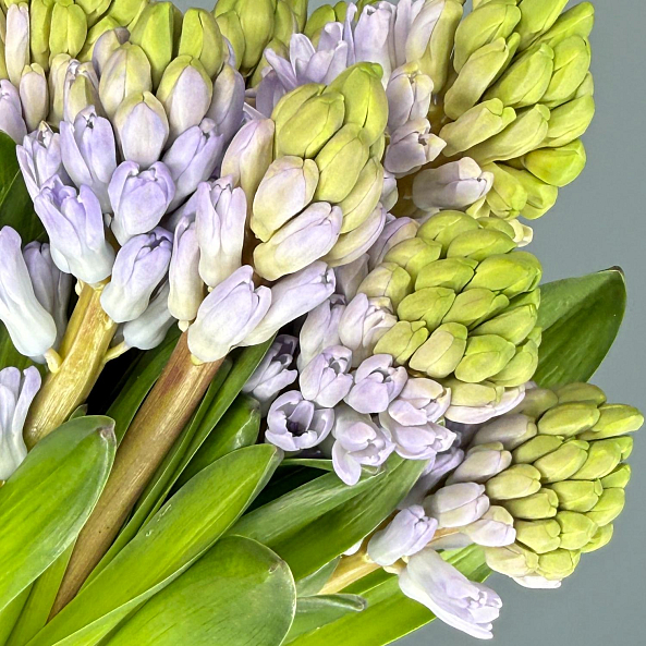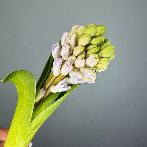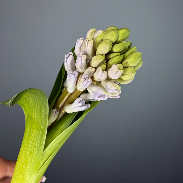Этот нежный цветок — словно застывший весенний рассвет, где сиреневые соцветия гиацинта, собранные в плотные колоски, дарят ощущение хрупкой нежности и утонченной романтики. Каждый лепесток, с его мягким перламутровым оттенком, словно окутан легким туманом, а нежный аромат напоминает о первых солнечных лучах. Длинный стебель с зелеными листьями придает композиции естественную грацию, превращая гиацинт в живой символ спокойствия и счастья.