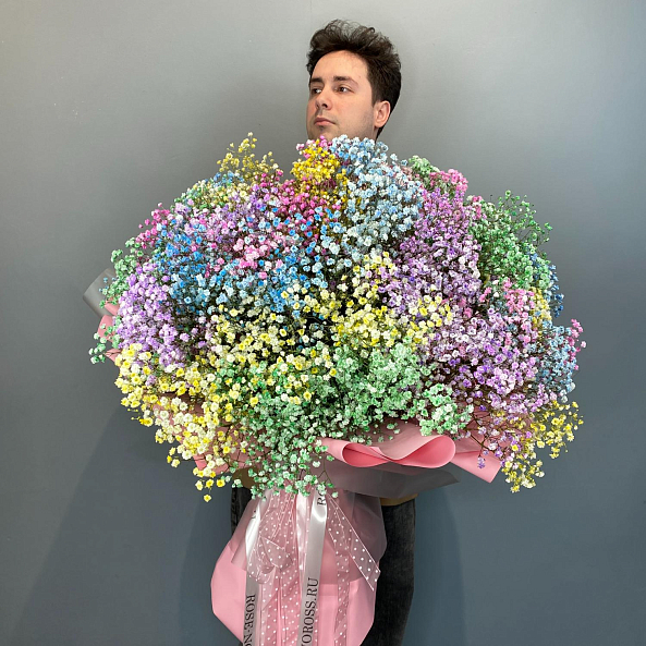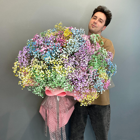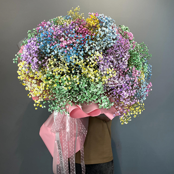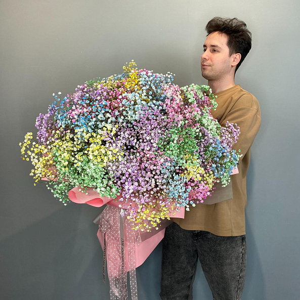 Нежность, свет и многообразие оттенков в одном букете! Гипсофила «Радужная» — это словно весна, собранная в яркий, но при этом деликатный подарок. Каждый стебель окрашен в пастельные тона, переливающиеся от розового и лавандового до голубого и сиреневого.