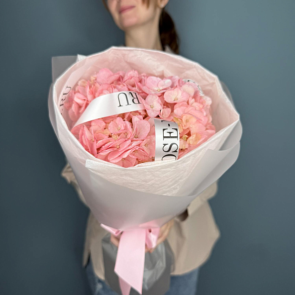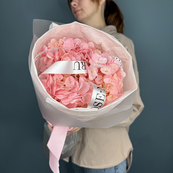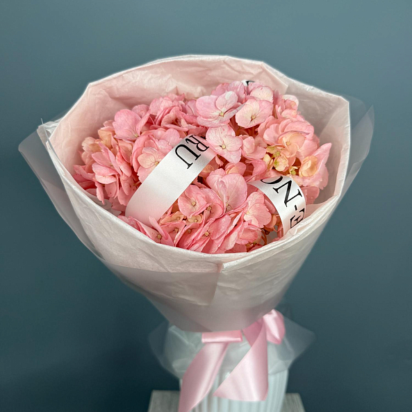 Гортензия нежно-розовая в изысканном оформлении — это воплощение романтики и утончённости. Пышный, воздушный букет с крупными соцветиями, аккуратно упакованный в прозрачную бумагу с лентой, создаёт атмосферу нежности и тепла. Идеально подойдёт в качестве подарка на День рождения, свидание или просто как тёплое напоминание о заботе и внимании.