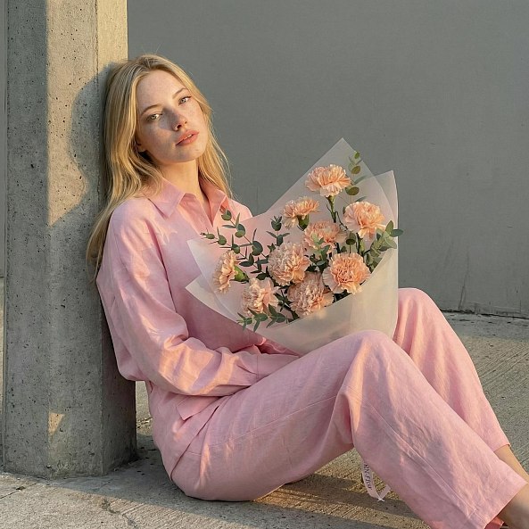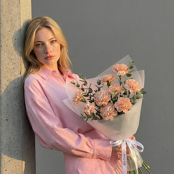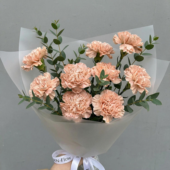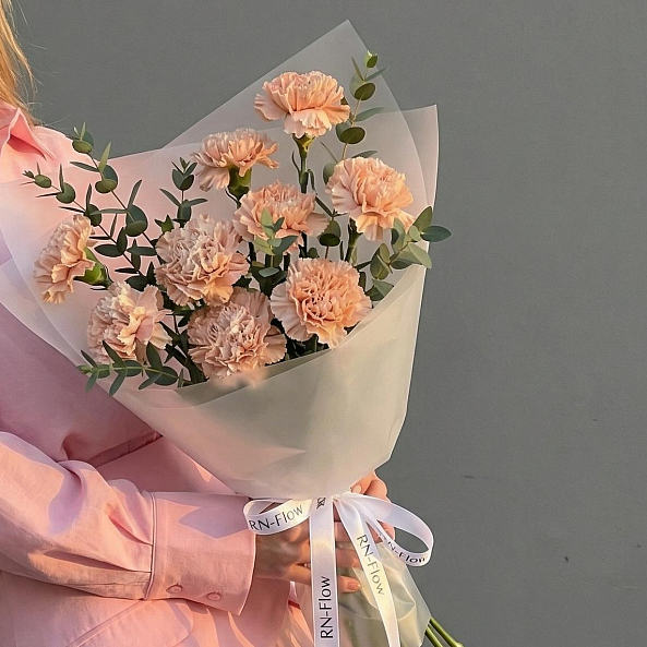 Этот изысканный букет — нежное переплетение коричневых гвоздик, словно застывших в лучах утреннего солнца, дарит ощущение тепла и уюта. Каждый бутон, с его плавным переходом от кремового к нежно-коричневому, создает атмосферу романтики, а аккуратные ветки эвкалипта придают композиции свежесть и естественную гармонию. Упакованный в прозрачную кальку с атласной лентой «RN-Flow», букет выглядит лаконично и современно, идеально дополняя как повседневный образ, так и особый момент.
