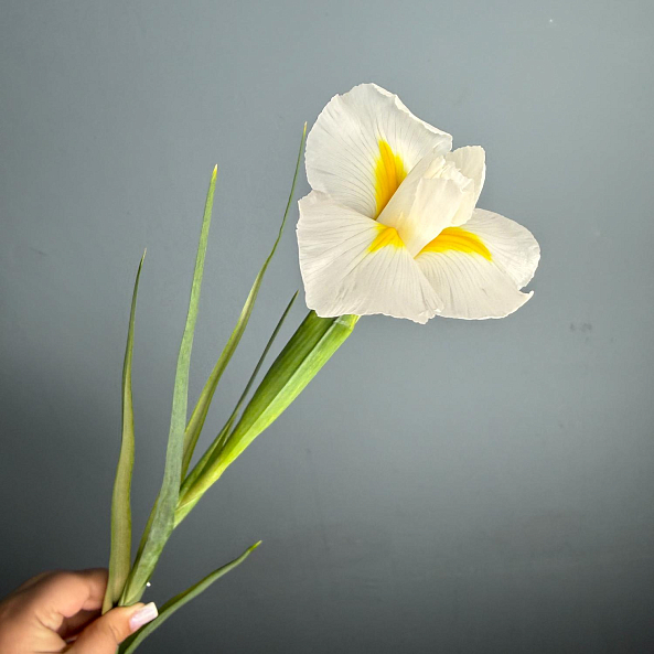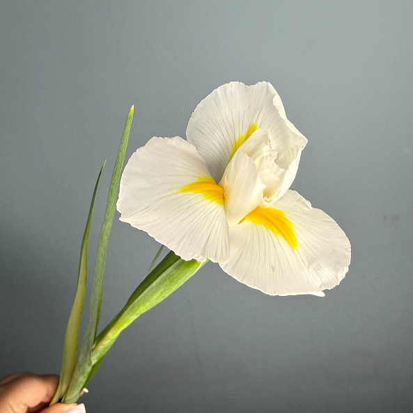 Погрузитесь в мир изысканной красоты с этим белым ирисом, чьи нежные лепестки словно сияют чистотой, а яркие желтые полосы в центре добавляют игривую нотку. Каждый цветок — это тонкое сочетание воздушности и силы, где белоснежные лепестки, украшенные тонкими прожилками, плавно переходят в теплый золотистый оттенок, создавая ощущение, будто в сердце цветка живет солнечный луч.