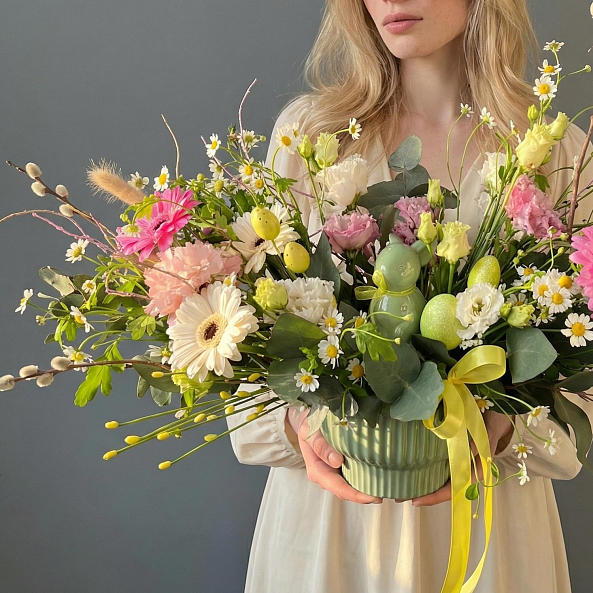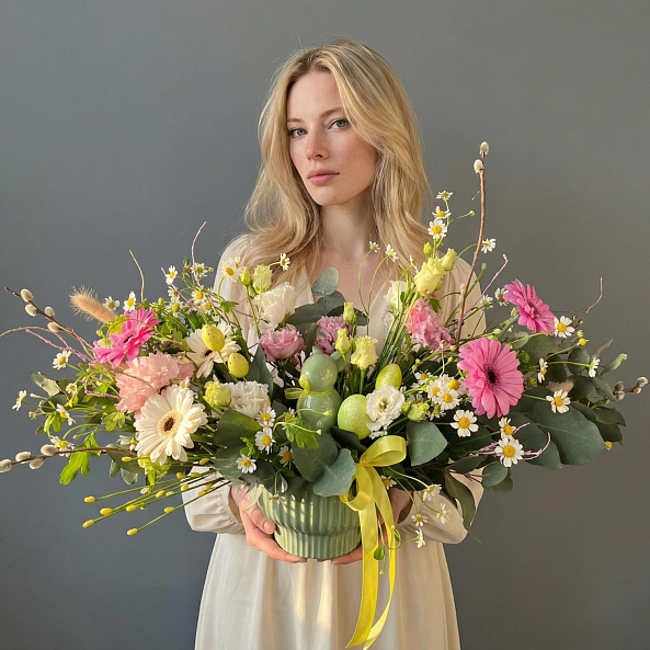 Этот очаровательный букет — настоящая симфония весеннего пробуждения, где пастельные оттенки и пасхальные символы сливаются в единый волшебный образ. В композиции переплетаются розовые герберы, белые ромашки, нежные розовые розы, зеленый эвкалипт и декоративные элементы: милый зеленый кролик, пасхальныеца в пастельных тонах и пушистые ветки. Каждая деталь, от ароматных цветов до уютного кролика, словно застывший момент из детской сказки, дарит ощущение тепла и праздничной радости.