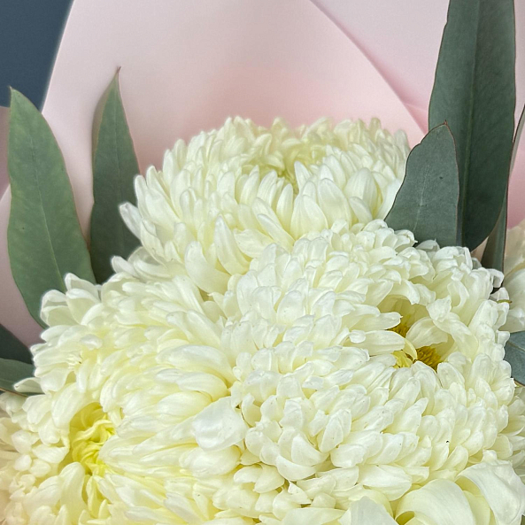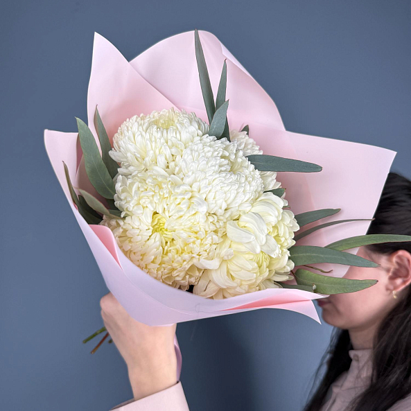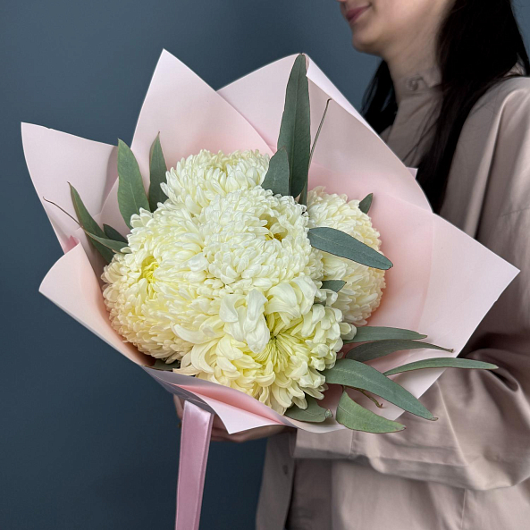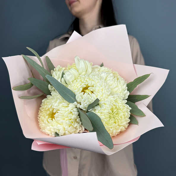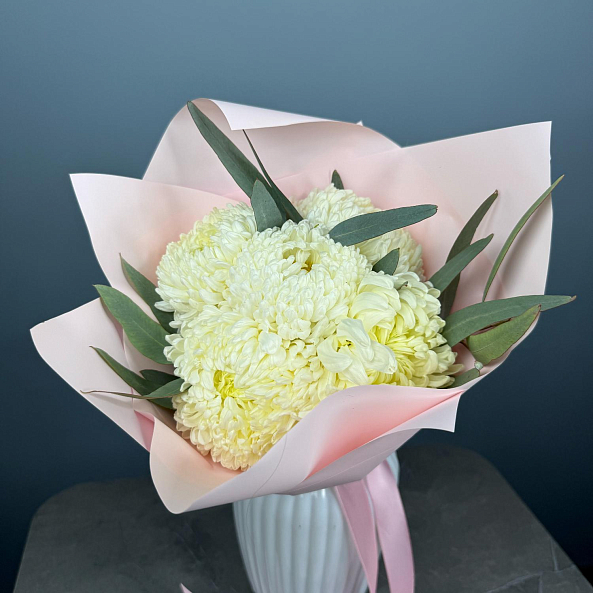 Нежный и свежий букет из 5 мини-хризантем «Лимонная» (Фред) — аккуратных, плотных цветков с кремово-белыми лепестками и легким лимонным отливом в центре. Веточки эвкалипта добавляют композиции воздушности, природной текстуры и тонкий аромат. Упаковка в мягкую пастельную бумагу с лентой подчеркивает простоту и утонченность букета. Идеальный выбор для нежного, искреннего подарка без повода.
