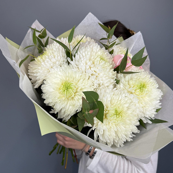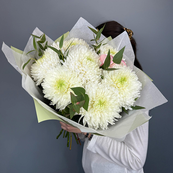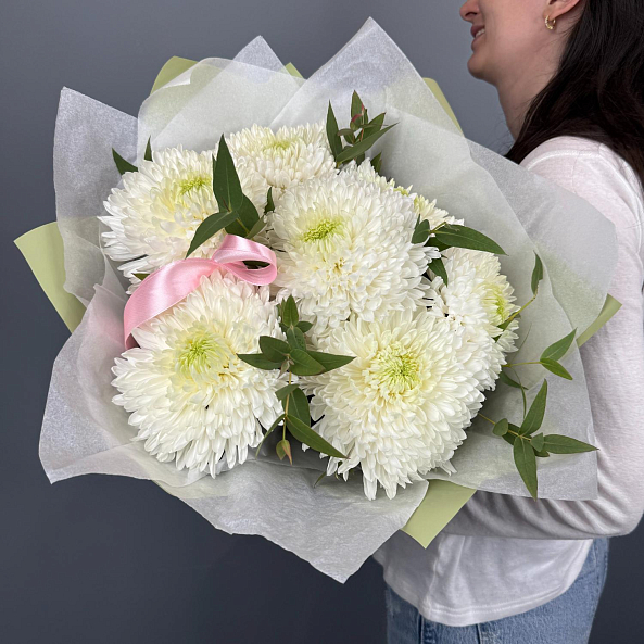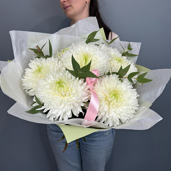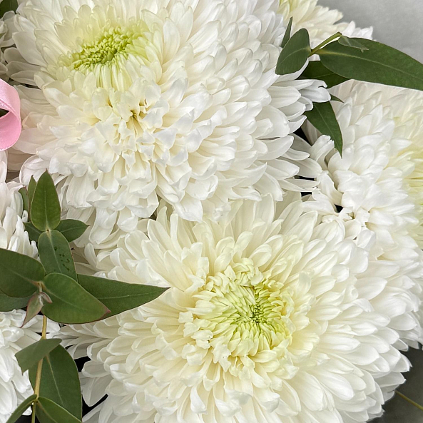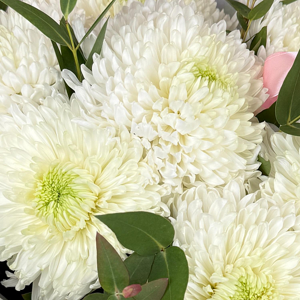 Чистота и нежность в одном букете. Пышные белые хризантемы, дополненные свежей зеленью эвкалипта и акцентной розовой лентой, создают изысканный и утонченный образ. Идеален для любого повода — от поздравления до выражения искренних чувств.