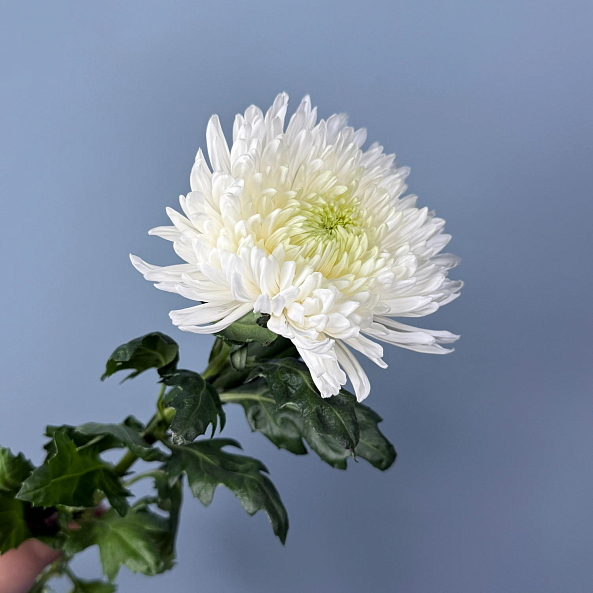 Белая хризантема — символ чистоты, спокойствия и искренности. Крупный, пышный бутон с нежными лепестками и яркой зеленью — идеальный выбор для подарка на день рождения, в знак благодарности или как элемент элегантного букета. Просто, изысканно, со вкусом.