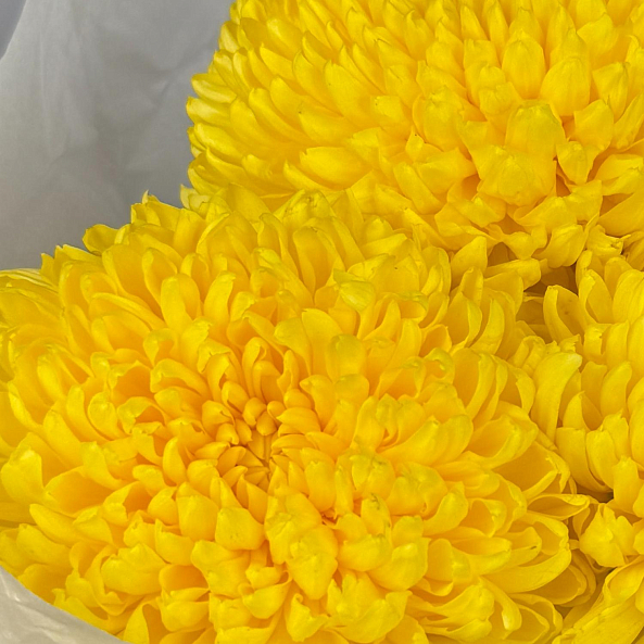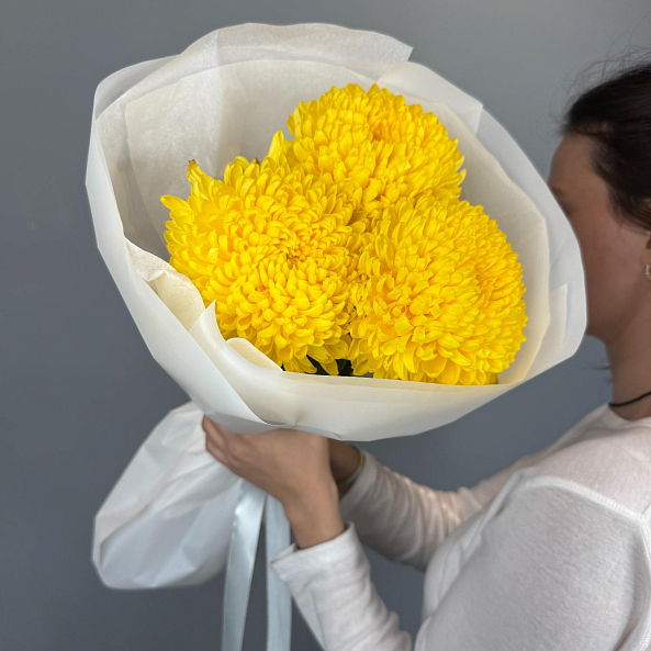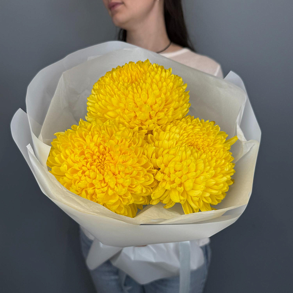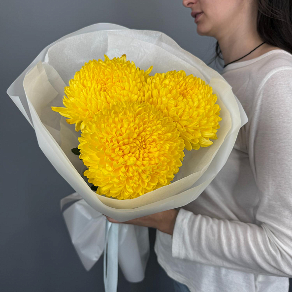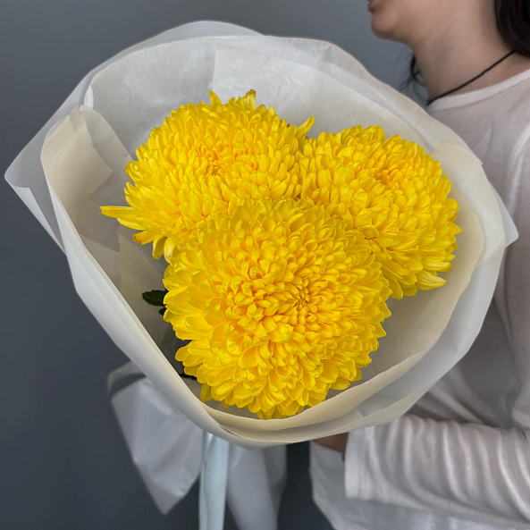 Яркий и жизнерадостный букет из сочных желтых хризантем. Простой, но очень эффектный — идеально подходит для того, чтобы подарить улыбку, поднять настроение или просто порадовать близкого человека. Чистая радость в каждом лепестке.