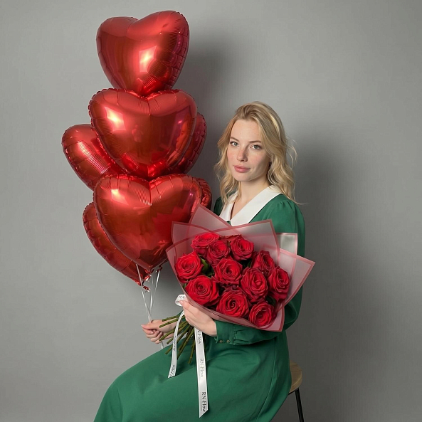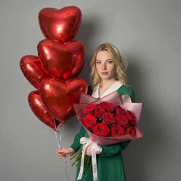 Комбо «Красное Сердце: 11 Роз Вечной Страсти и 7 Шаров Любви»