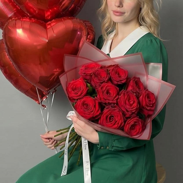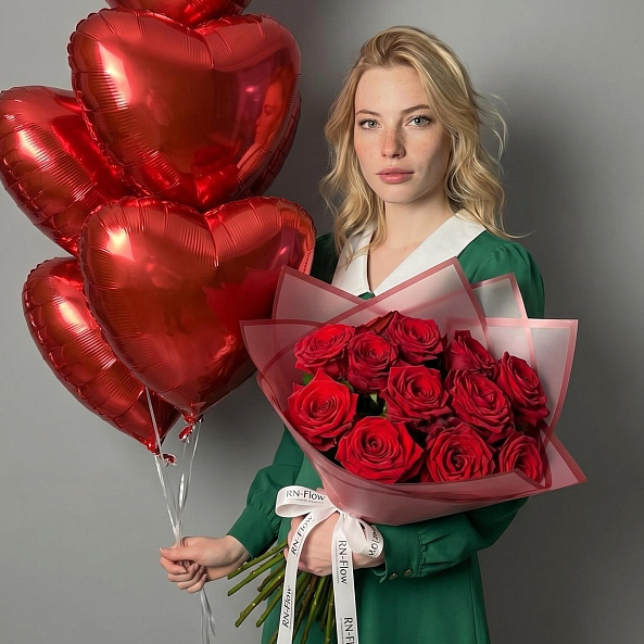 Этот очаровательный набор — настоящая симфония страсти и романтики, где 11 насыщенных красных роз высотой 70 см сливаются с 7 красными фольговыми шарами в форме сердца, создавая гармоничную композицию, словно застывший волшебный момент из самой страстной сказки. Букет, упакованный в прозрачную кальку с красной атласной лентой «RN-Flow», и блестящие шары с гелиевым наполнением дарят ощущение глубины чувств и элегантности, идеально дополняя любой особый момент.