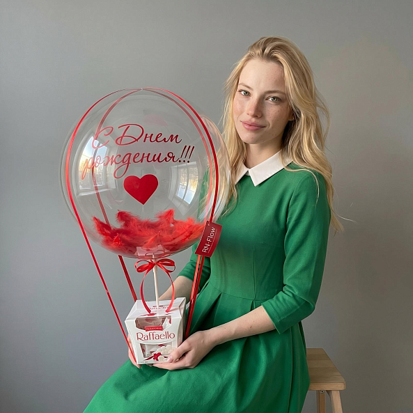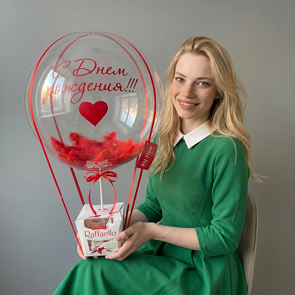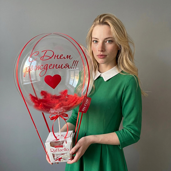 Этот очаровательный подарок — настоящая симфония праздника и внимания, где прозрачный воздушный шар с надписью «С Днём рождения!!!» в красном цвете, дополненный яркими перьями, сливаются с коробкой премиум-конфет Raffaello, создавая композицию, словно застывший момент из самого волшебного дня.