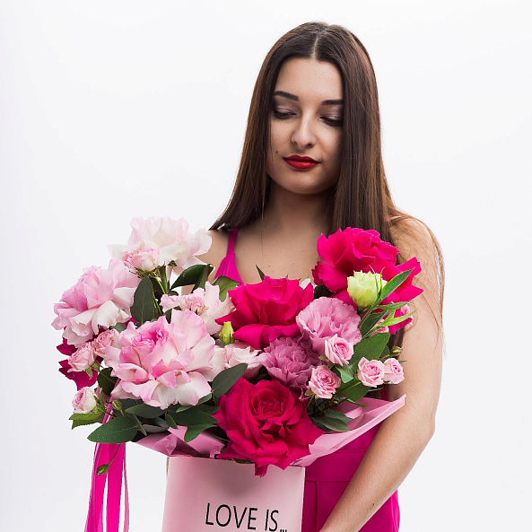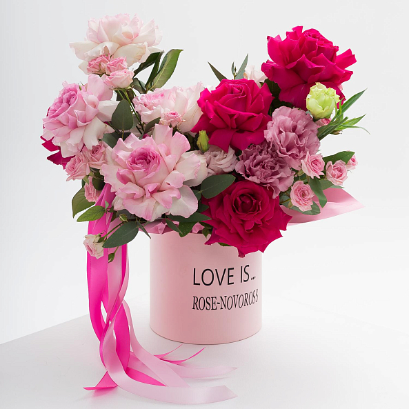 Погрузитесь в мир бесконечной романтики с этим изысканным букетом, где нежные пастельные розы, ярко-розовые пионы и пышные гвоздики создают симфонию цветов, напоминающую закат, застывший в самом сердце любви. Каждый лепесток, от мягкого персикового до глубокого фуксия, дышит теплом и страстью, а свежая зелень эвкалипта добавляет композиции легкости. Все это объединено в розовой цилиндрической коробке с загадочной надписью «LOVE IS» и логотипом «ROSE-NOVOROSS», превращая букет в не просто подарок, а живое послание, которое останется в памяти навсегда.