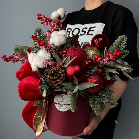 Яркие красные шары, пушистый хлопок, свежая хвоя и блестящие элементы — это не просто декор, а целое настроение. Идеальна для дома, офиса или в качестве подарка.