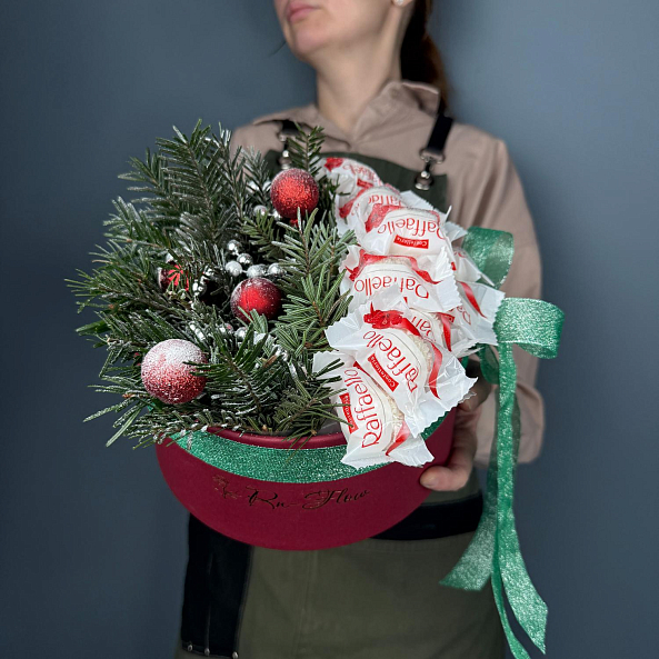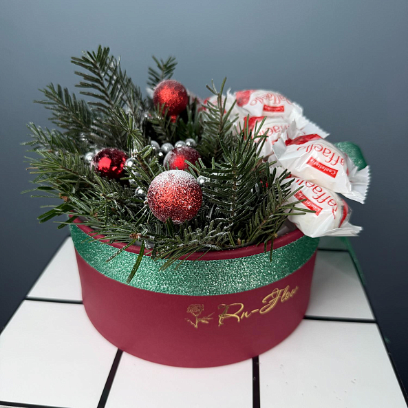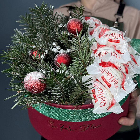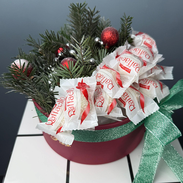 Конфеты Raffaello, свежая хвоя, пышные шарики и блестящие украшения — это не просто подарок, а целое настроение. Идеален для тех, кто ценит уют, сладости и праздничную атмосферу. Цвет Украшений может меняться по желанию