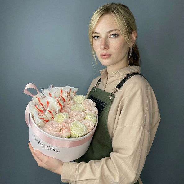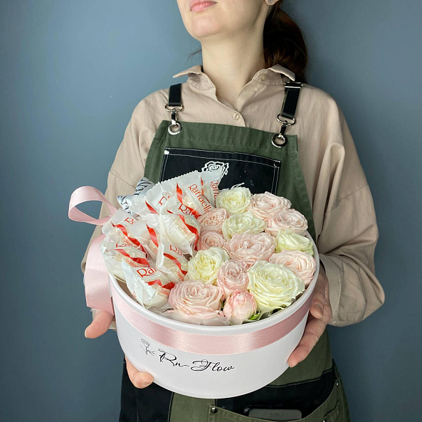 Коробка с пионовидными розами и конфетами. "Вайт Пиони", "Мисс Пиони".