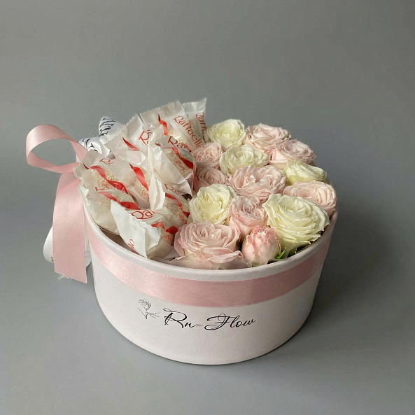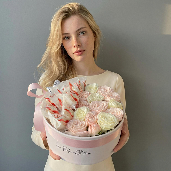 Коробка «Сладкая нежность» — Пионовидные розы белые и розовые + Конфеты