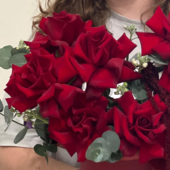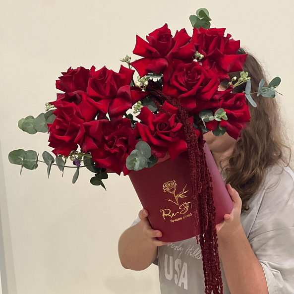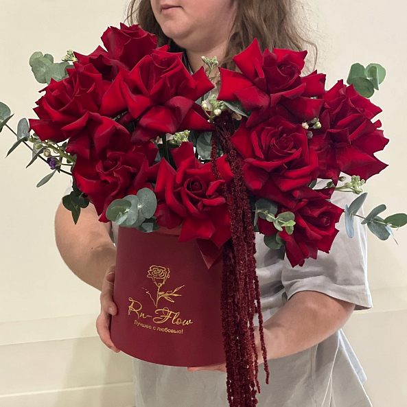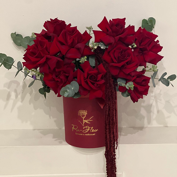 Элегантная композиция в коробке — сочетание глубокой бордовой розы "Эксплорер" с нежной белой маттиолой и серебристым эвкалиптом. Добавленные сухоцветы придают текстуру и трендовую природную нотку.