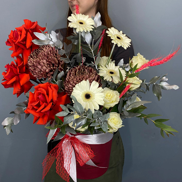 Коробка с цветами. Французская Роза "Нина", Хризантема Бигуди, Гербера, Роза , Сухоцвет Пшеница, Эвкалипт.