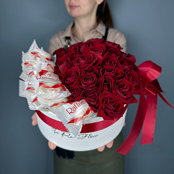 Коробка с цветами и конфетами. "Ред Дайменшн" кустовая роза , "Рафаэлло"