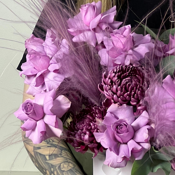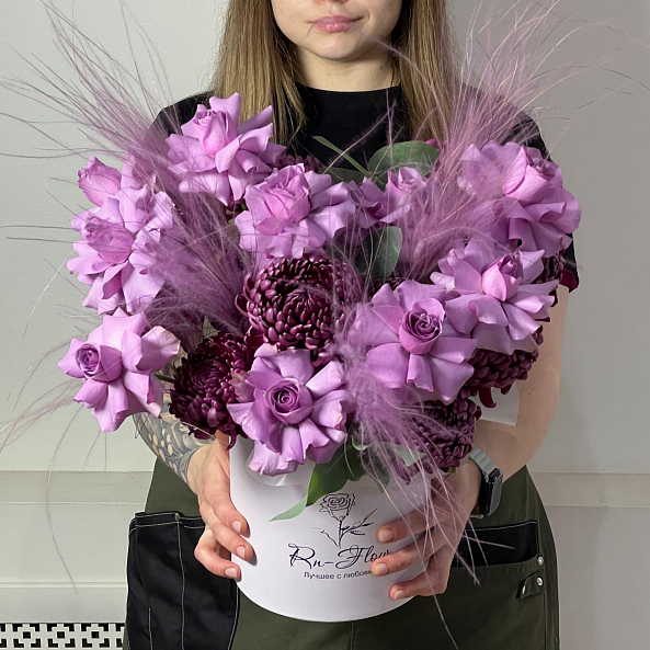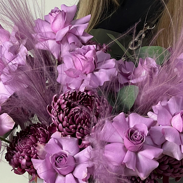Глубокий фиолетовый оттенок хризантемы «Бигуди», нежные розы сиреневые «Найтингейл» и воздушный ковыль — элегантная, почти сказочная композиция в белой коробке. Идеальный подарок для тех, кто ценит изысканность и необычную красоту.