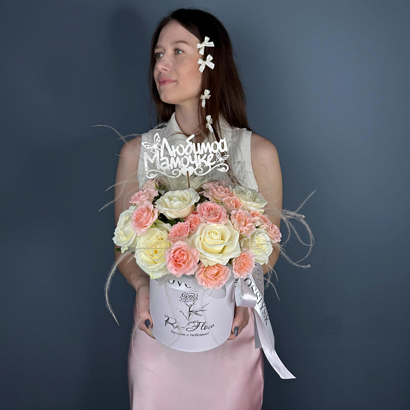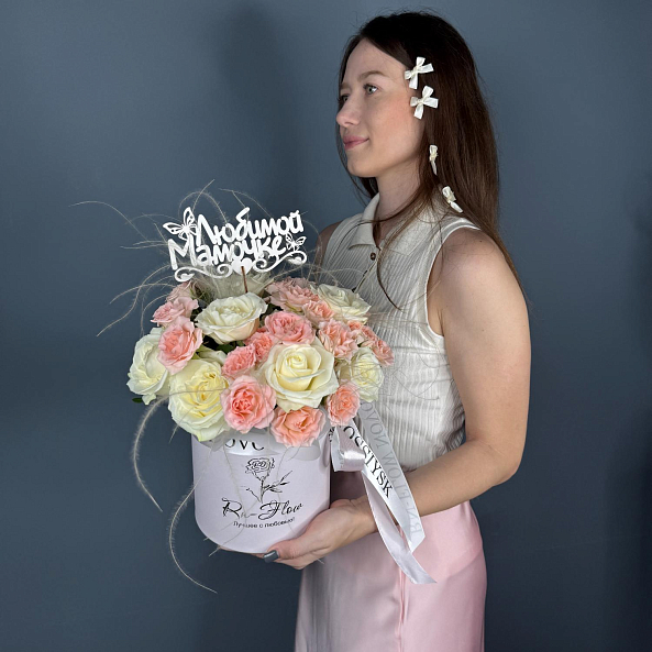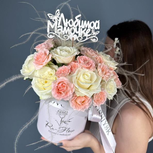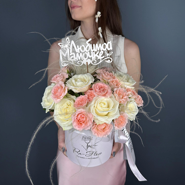 Коробка с цветами. "Мамина Забота". Кустовая Роза, Роза Белая, Ковыль.