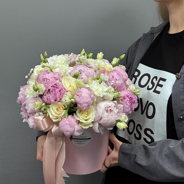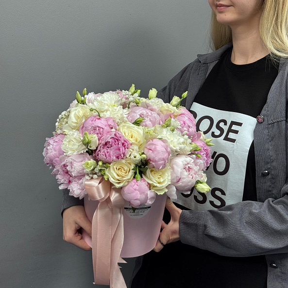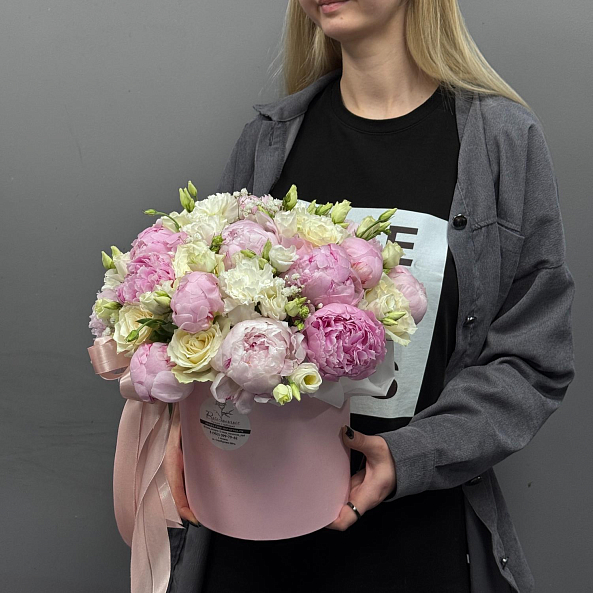 Коробка с цветами: пионы, эустома, роза "Атена", гвоздика (диантус) и белая гипсофила — яркая и изысканная композиция, объединяющая нежность, изящество и природную красоту. Идеальный подарок для поздравлений, романтических моментов или создания атмосферы радости и уюта.
