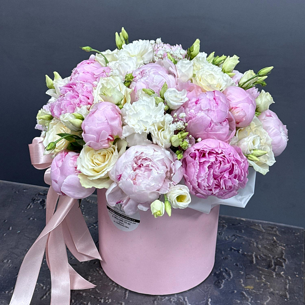 Коробка с цветами. Пионы, Эустома, Роза "Атена", Гвоздика (Диантус), Гипсофила Белая.