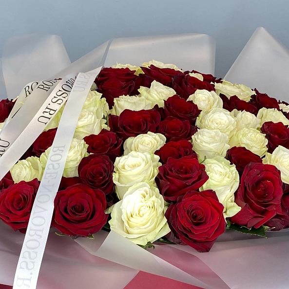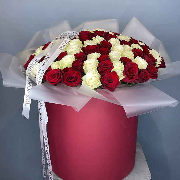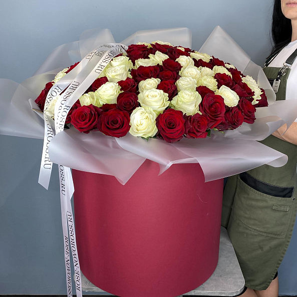 Коробка с цветами: 101 роза "Эксплорер" и "Мондиаль" из Эквадора (Премиум)
