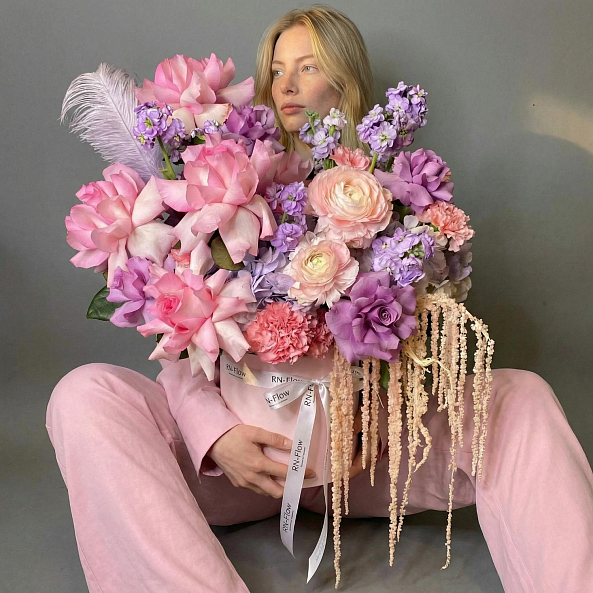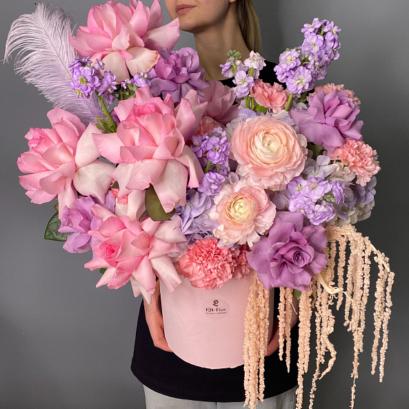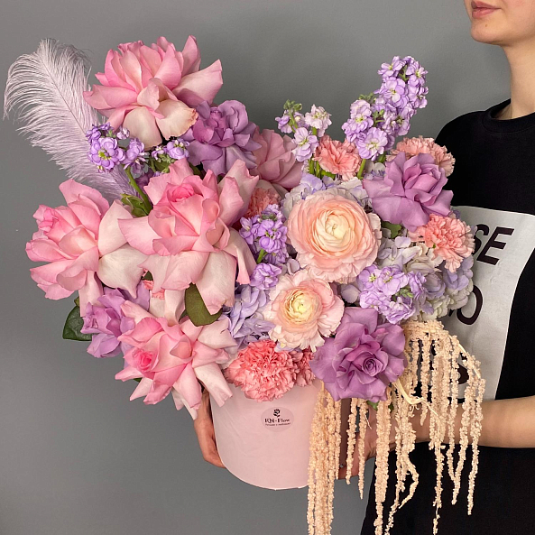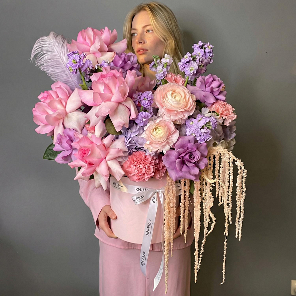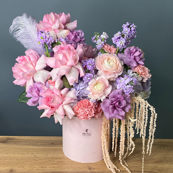Этот пышный букет в розовой коробке — настоящий вихрь эмоций, где розовые розы, фиолетовые гортензии, нежные ранункулюсы и ароматные гвоздики переплетаются в динамичную композицию, словно застывший волшебный сад. Каждый цветок, от бархатистых лепестков пионовидных роз до мелких фиолетовых соцветий, дарит ощущение глубины и изысканности, а декоративные перья и висящие нити придают образу аристократичной легкости. Упакованный в розовую коробку с лентой «RN-Flow», букет выглядит как произведение искусства — идеально дополняя свадебный образ или романтический вечер.