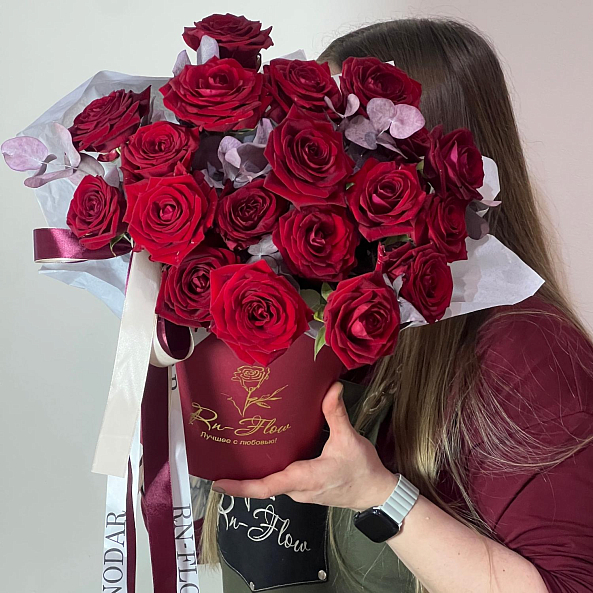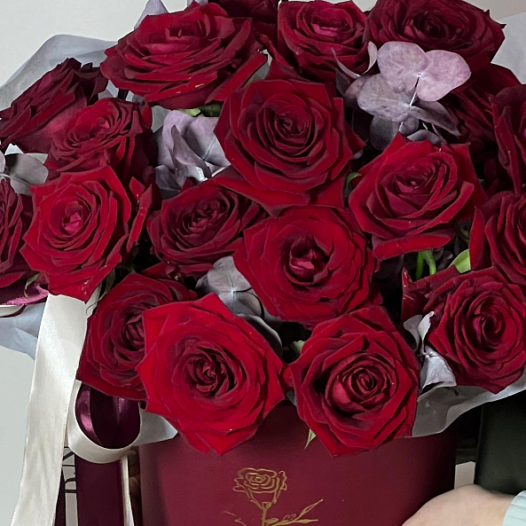 Коробка «Глубокая страсть» — Розы «Ред Наоми» + Эвкалипт