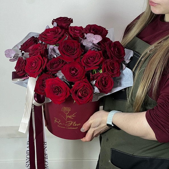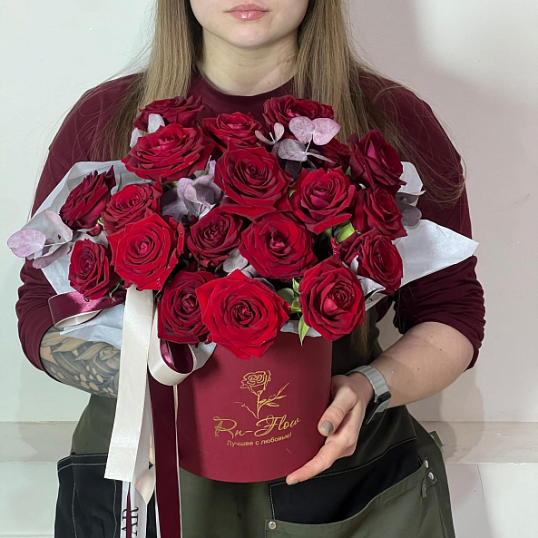 Коробка с цветами. Роза "Ред Наоми", Эвкалипт.