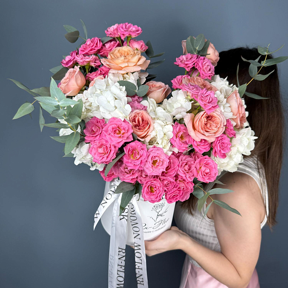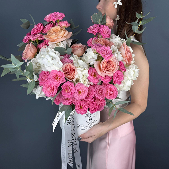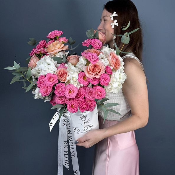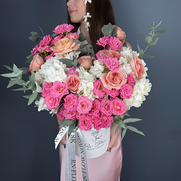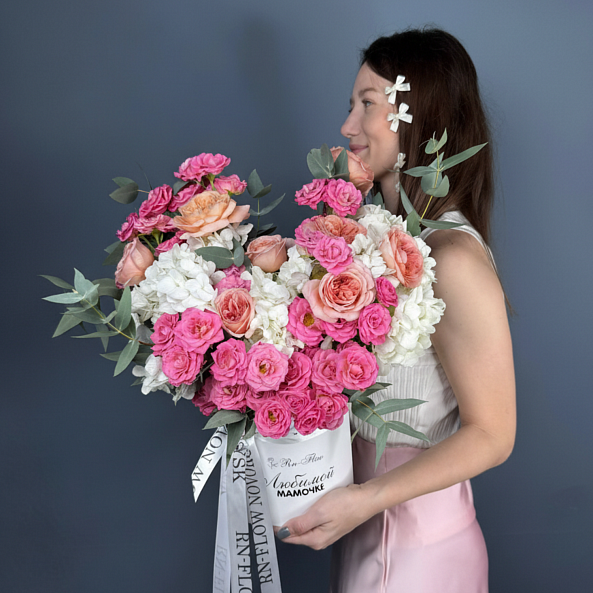 Коробка с цветами. "Самая нежная, Мама". Пионовидная роза, Кустовая Роза, Гортензия, Эвкалипт.