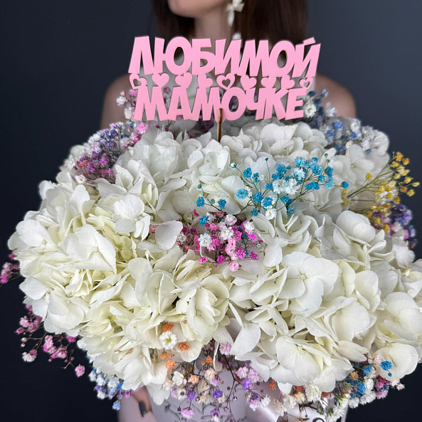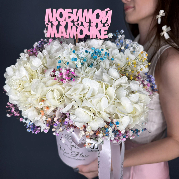 Коробка с цветами. «Сколько раз говорила?». Гортензия, Гипсофила Радужная.