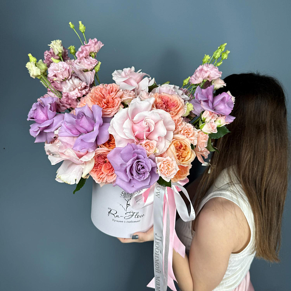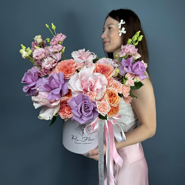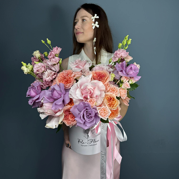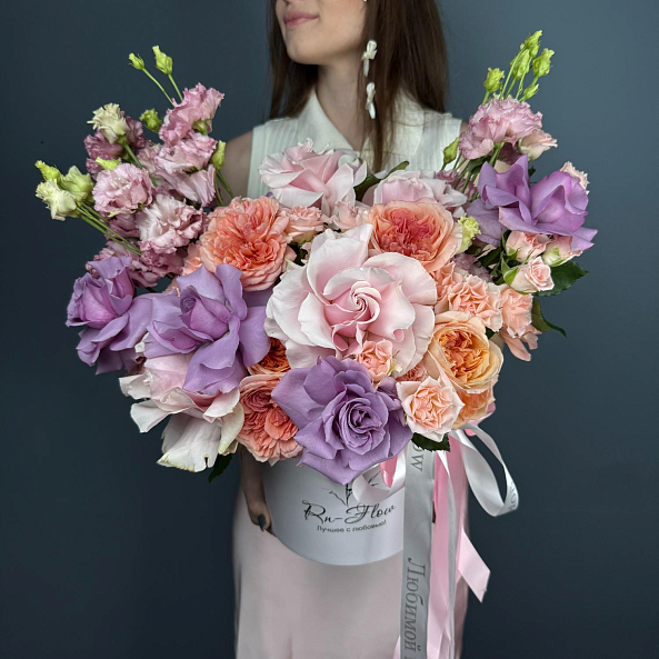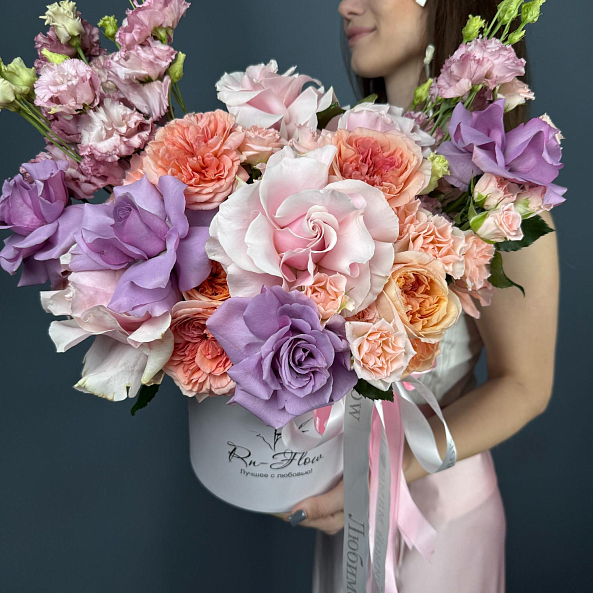 Коробка с цветами. "Спасибо, что ты есть". Пионовидная Роза, Эустома Махровая, Кустовая Роза.