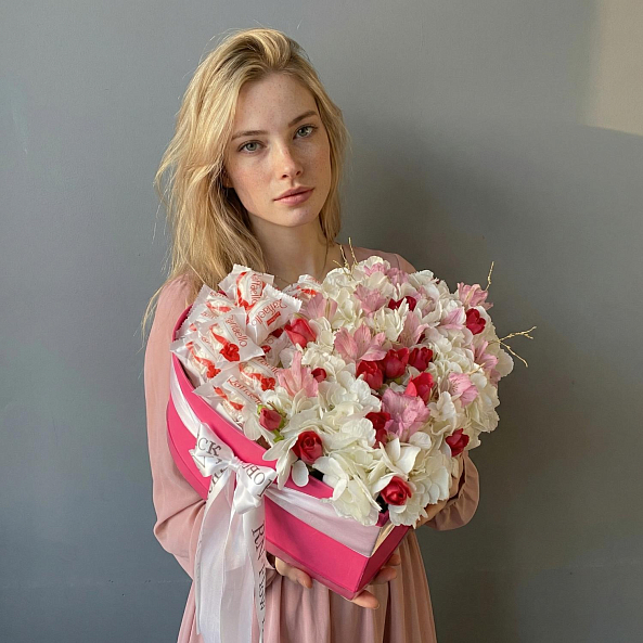 Коробка "Сердце" с цветами и конфетами.